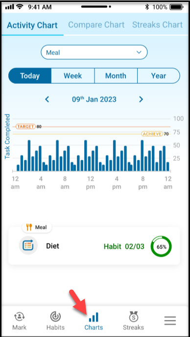The Habit Tracker app has a ‘Chart’ tab that offers detailed habit analysis. The ‘Activity, Compare & Streaks Chart’ shows daily, weekly, monthly, or yearly data. Use it to visualize activity, track streaks, and optimize strategies for successful habit management. Embrace this feature and gain valuable insights for successful habit management.