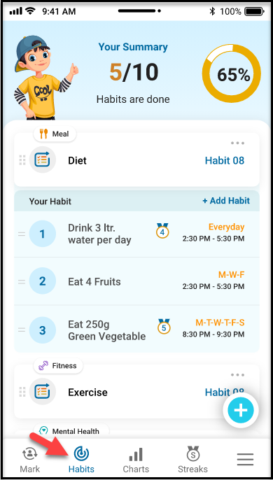 To keep a trail of your daily, weekly, or monthly habits, use the “Habits” tab to organize them as needed. Customize the recurrence pattern of each habit to set the target required for your goals, hourly, daily, or weekly. You can repeat this process for multiple habits. You can (use the ‘+’ sign to) add or (Delete option to) delete any habit from the app as and when you feel, under various Categories and Types, such as Fitness, Mental health, Work, etc.