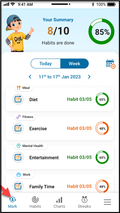 Our Habit Tracker app helps you track habits easily and accurately with the ‘Mark’ tab. You can view daily or weekly progress and stay accountable by tracking your target percentage or amount achieved. Establish routines and break bad habits with self-awareness and progress tracking.